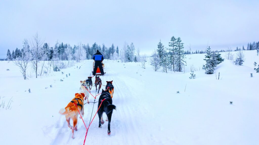 Μια από τις πιο δημοφιλείς δραστηριότητες στη Λαπωνία είναι οι εκδρομές με έλκηθρα που σέρνουν σκύλοι husky. Οι επισκέπτες έχουν τη δυνατότητα να κινηθούν μέσα σε χιονισμένα δάση και να γνωρίσουν μια παραδοσιακή μορφή μετακίνησης των αρκτικών περιοχών. Οι εκδρομές πραγματοποιούνται σε οργανωμένες διαδρομές και συνοδεύονται από έμπειρους οδηγούς.