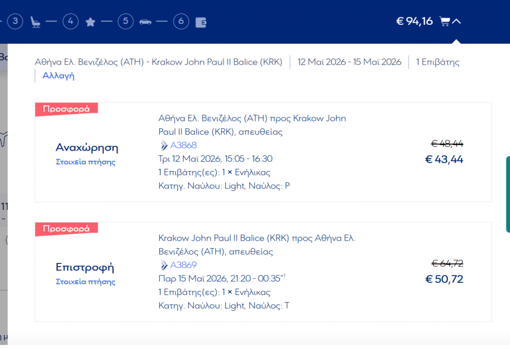 | Επιστροφή | 15 Μαΐου 2026 | 21:20 από Κρακοβία (KRK) | 00:35 στην Αθήνα (ATH) |