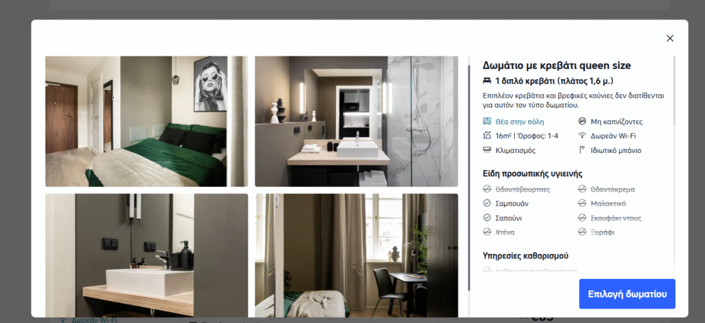 Τύπος Δωματίου: Δωμάτιο με κρεβάτι queen size Διάρκεια: 3 διανυκτερεύσεις (12 – 15 Μαΐου 2026) Μέγεθος: 16τ.μ., Θέα στην πόλη. Παροχές: Δωρεάν Wi-Fi, Κλιματισμός, Ιδιωτικό μπάνιο.