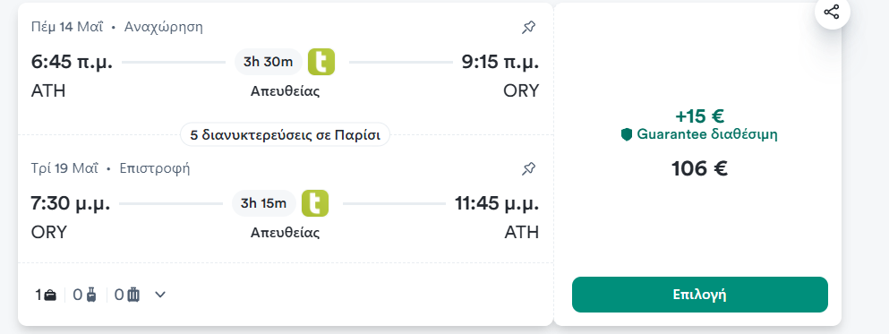 (Απευθείας πτήσεις Αθήνα – Παρίσι – Αθήνα. Ανταγωνιστική τιμή για Μάιο, με απευθείας δρομολόγιο και χειραποσκευή καμπίνας, ιδανικές ώρες που εξασφαλίζουν ουσιαστικά γεμάτη πρώτη και τελευταία ημέρα.)