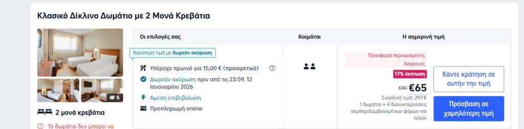 Τύπος Δωματίου: Κλασικό Δίκλινο Δωμάτιο με 2 Μονά Κρεβάτια (15 τ.μ.) Διάρκεια: 4 διανυκτερεύσεις (19 – 23 Ιανουαρίου 2026) Συνολικό κόστος: 297€ για 2 άτομα (περιλαμβάνονται φόροι και τέλη).