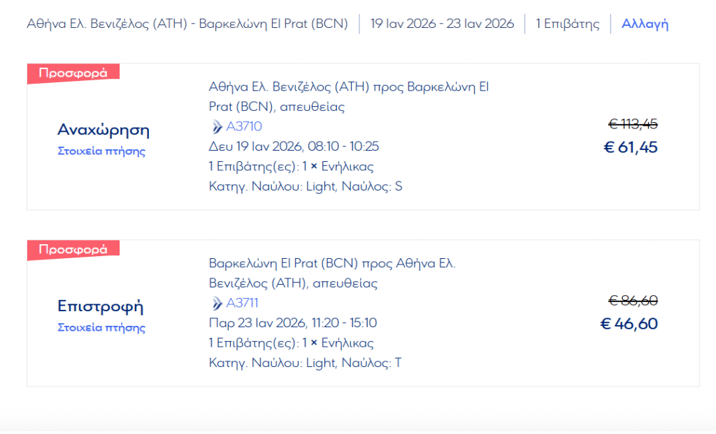 | Επιστροφή | 23 Ιαν 2026 | 11:20 από Βαρκελώνη (BCN) | 15:10 στην Αθήνα (ATH) |