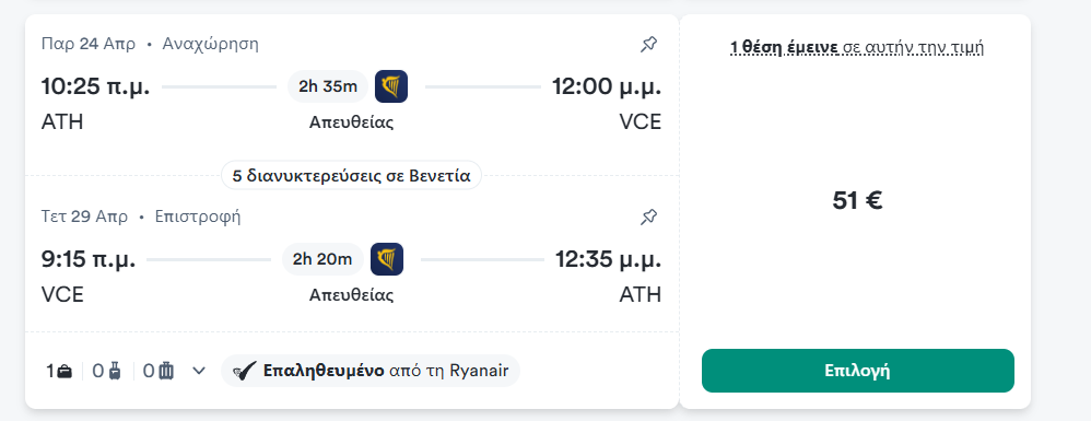 Το ταξίδι ξεκινά με απευθείας πτήση της Ryanair από Αθήνα (ATH) προς Βενετία (VCE).
