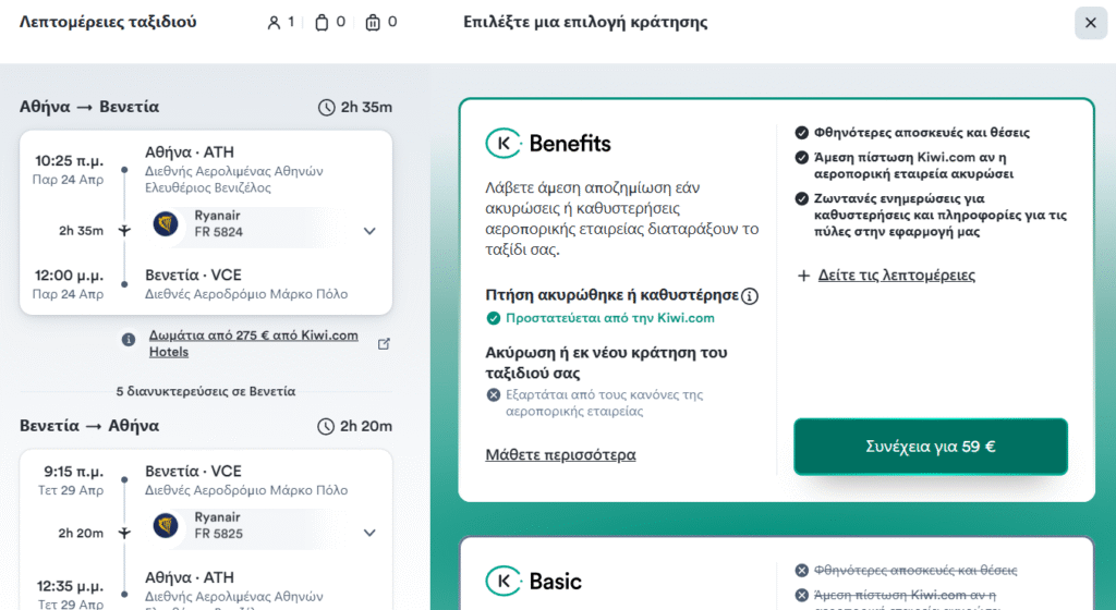 👉 Σημαντικό: Αν θέλετε να κλείσετε το συγκεκριμένο Travel Deal για Βενετία με τις ημερομηνίες και τα εισιτήρια που προτείνουμε, αξίζει να προσθέσετε τα Kiwi Benefits.